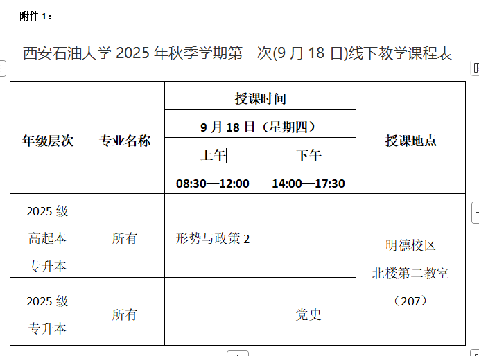 具体通知详见附件1: 西安石油大学2025年秋季学期第一次(9月18日)线下教学课程表
