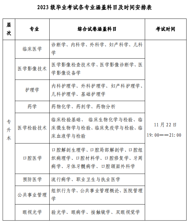 毕业考试为综合试卷形式,各专业考试涵盖科目及具体考试时间见下图
